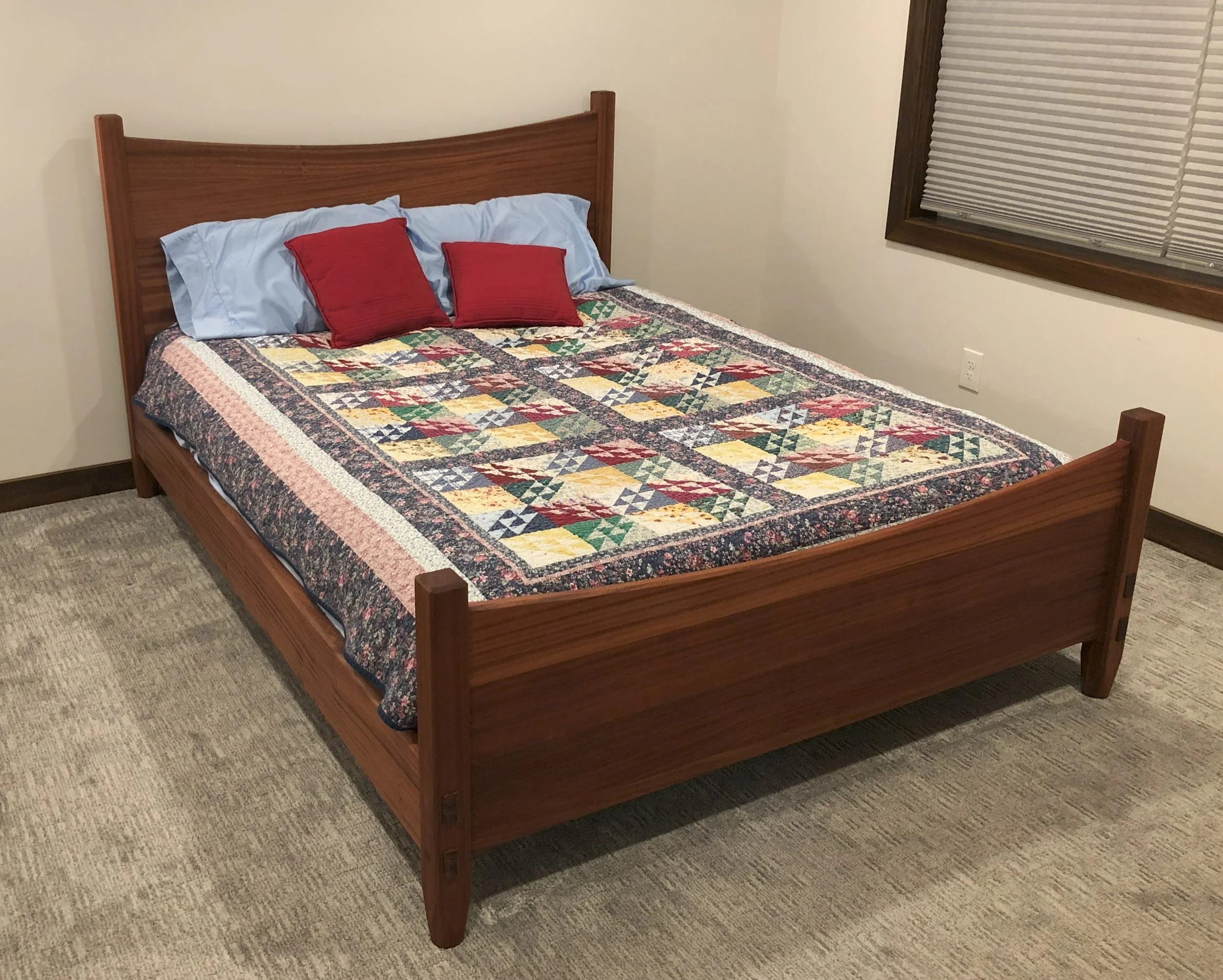 This bedframe was my first commission after starting Christoph Fine Woodworking, and it remains one of my favorites. The shaker style, with its minimal ornamentation, lets the beauty of the wood and quality of the joinery stand out. Like all my large furniture, this piece can be dissembled for transport, in this case by removing the subtly angled wooden pins that pull the double tenons of the rails tight against the legs. More complex joinery is hidden in the headboard, which is attached to the legs by shouldered sliding dovetails (this is similar to the breadboard ends featured on many breadboards and tables). I chose this method of attachment to ensure that wood movement perpendicular to the grain in the large panel against the unmoving vertical grain of the legs would not cause cracking over time.